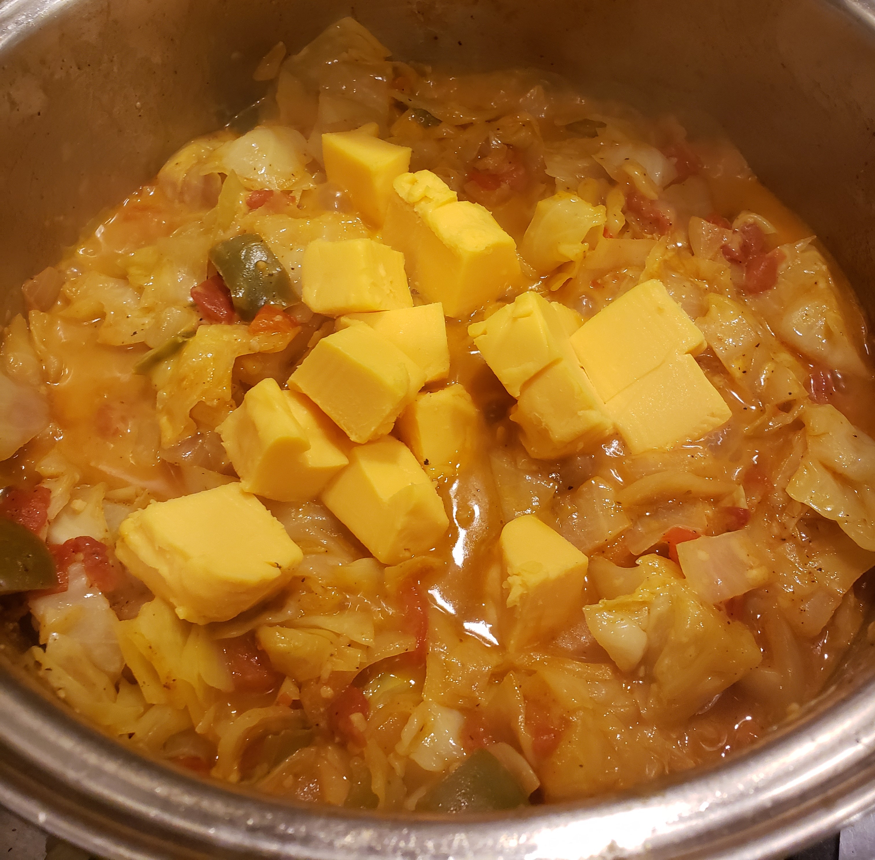 Remove the lid and stir to combine the cheese with the cabbage mixture. If the cubed cheese does not seem melted enough, you can replace the lid on the pot and give it a little more time. Taste to adjust the seasonings.