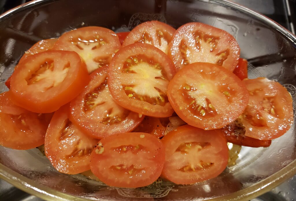 Arrange the slices of tomato over the onions and peppers. Sprinkle with one tablespoon of minced garlic and sprinkle with salt and pepper.
