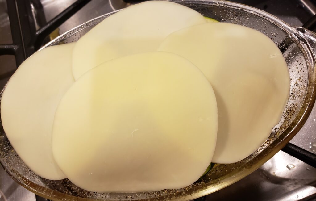 Place the slices of provolone on top of the zucchini.