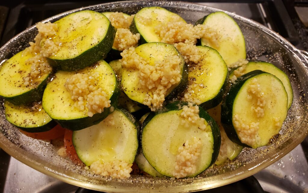 Place the slices of zucchini over the tomatoes. Sprinkle with the remaining garlic and more salt and pepper.