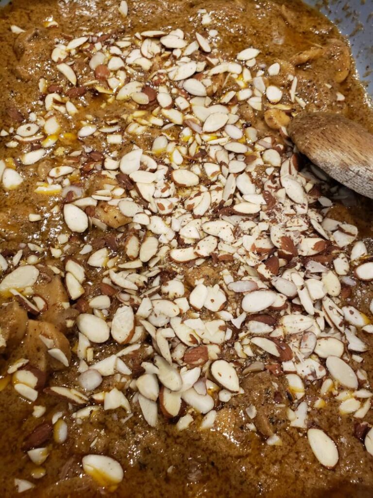 - Add the sliced almonds and stir until almonds are heated.