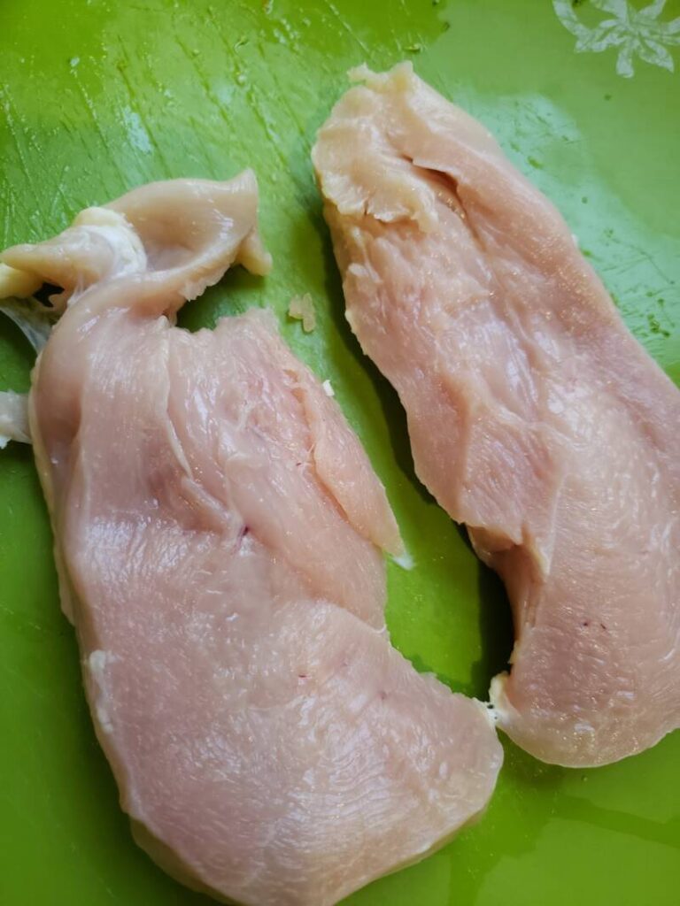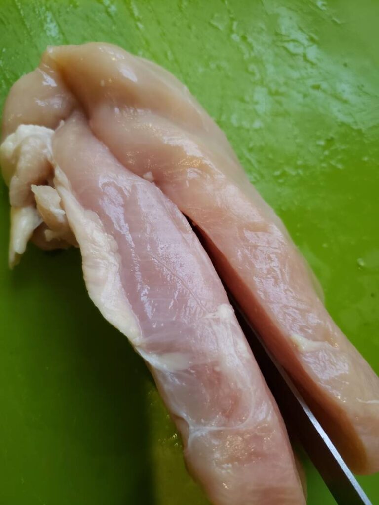 In many instances, chicken breasts are huge. Slice the chicken breasts in half through the middle widthwise as if you were making a pouch, but cut it all the way through to render two chicken breasts. Chicken breast is expensive nowadays, so cutting the breasts in half will stretch your budget.