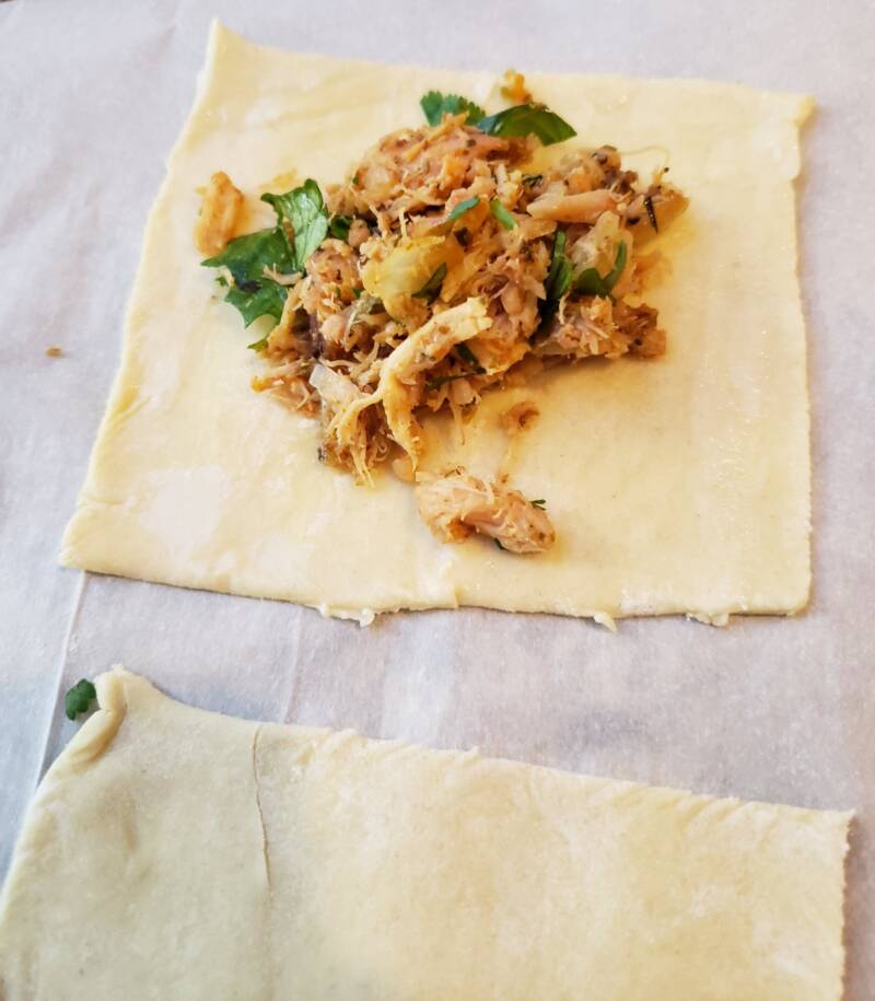 - To form the empanadas, fill a little dish with some room-temperature water. Imagine each square you work with is separated in half by a diagonal. Place a couple of tablespoons of filling in the top half. Dip a finger into the water and moisten the edges of the top half with water. Fold the bottom half to meet the edges of the top half.