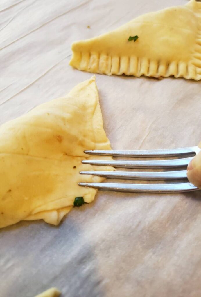 Use a fork to pinch and seal the edges. Lightly brush the tops with vegetable oil. Place finished pockets on a nonstick baking sheet and bake for about 12 to 14 minutes, or until golden brown and puffy.