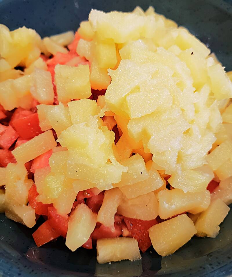 - For the pineapple salsa, combine the chopped tomatoes, pineapple, garlic, jalapeno and scallions in a medium bowl. Mix well. Add lime juice, sugar, and salt, to taste. Toss well.