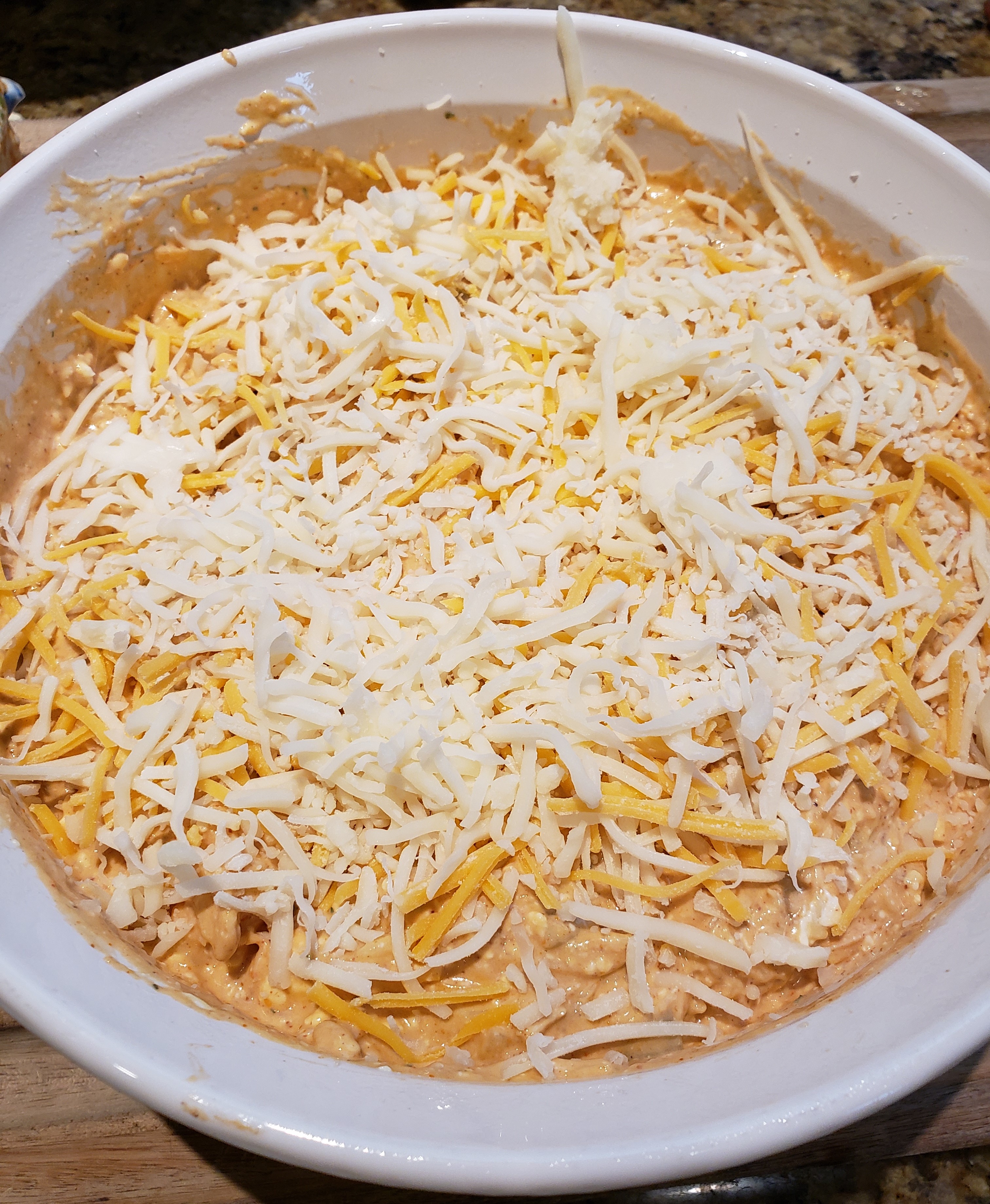 Spray a round casserole dish with cooking spray. Transfer the dip mixture to the casserole dish and top it with the cheese that was set aside.