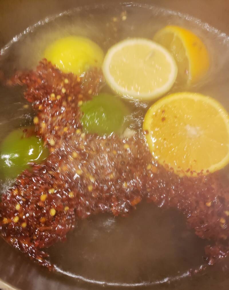 - In a large pot or Dutch oven, combine the water, lemon halves, orange halves, lime halves, red pepper flakes and salt.