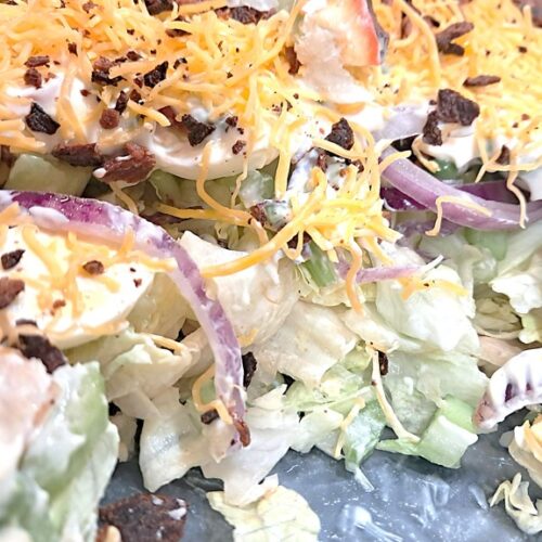 Along with the traditional layer of hard-boiled eggs, I’m adding something extra from my sponsor: their Pickled Quail Eggs. Sterling Farms‘ Pickled Quail Eggs are carefully handled, cleaned, and inspected before packaging, ensuring exceptional quality in every jar. The addition of these little gems brings a tangy pop of flavor and depth to elevate this favorite salad to the next level. These pickled quail eggs aren’t just delicious; they’re versatile. They make a fantastic low-carb snack, a standout addition to a charcuterie board, a tasty garnish for a Bloody Mary cocktail, or, like I’m showing you today, a flavorful upgrade to a beloved family recipe.