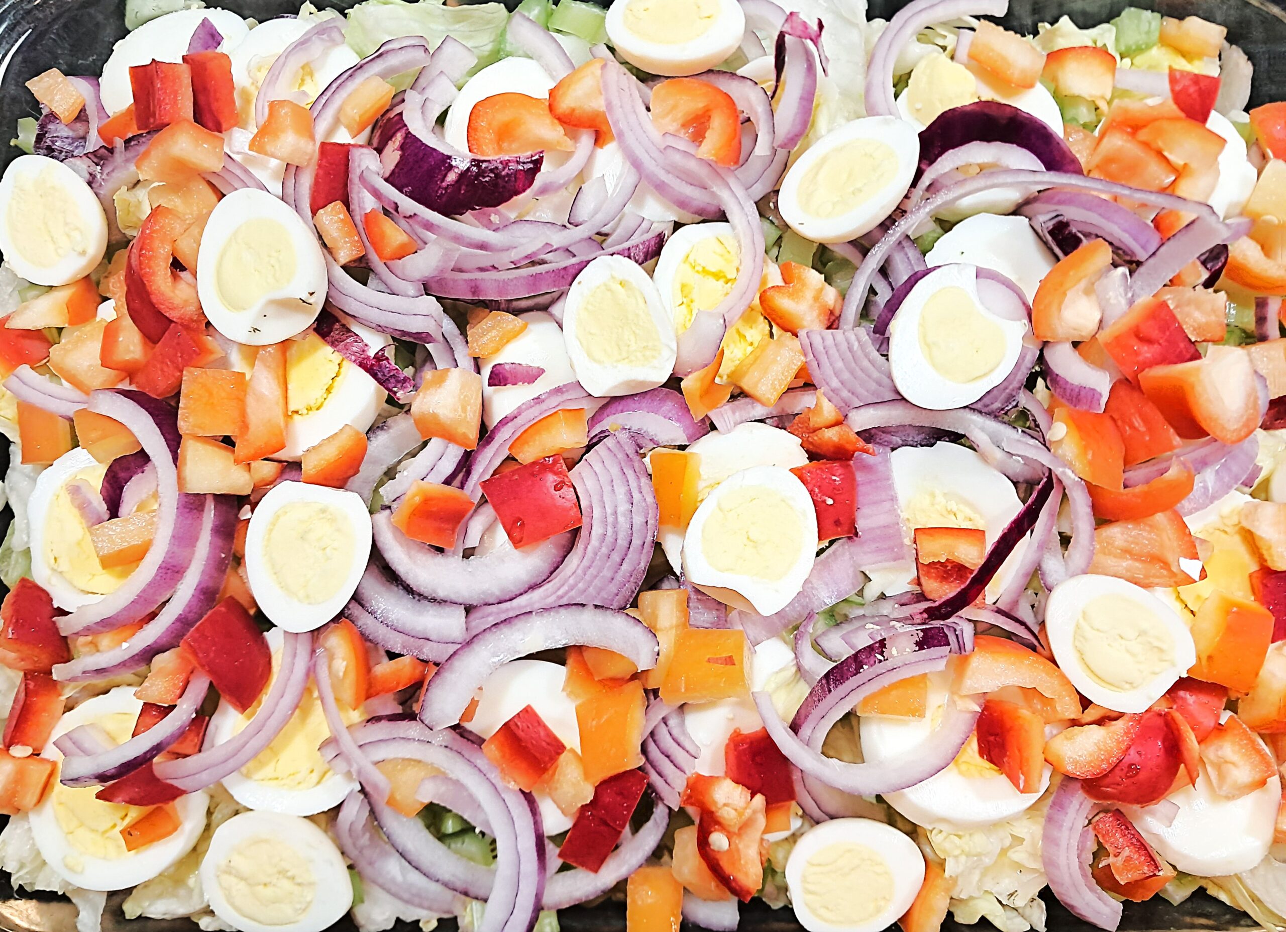 - Layer the hard-boiled eggs over the lettuce and celery layers.
