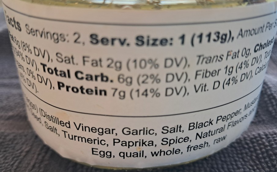 - 1 small jar Sterling Farms Pickled Quail Eggs cut in half