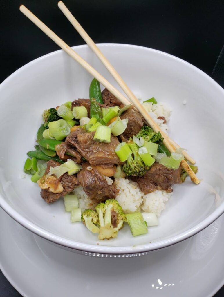 Add the sauce and stir until thickened. Return the beef to the wok and cook until hot. Serve over cauliflower rice or regular rice.