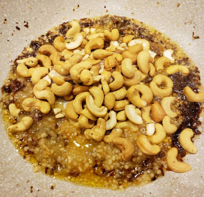 - Add the garlic, ginger paste, red pepper flakes and cashews to the wok. Stir fry for one minute.