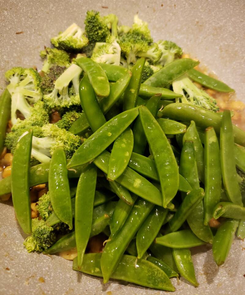 - Add broccoli and sugar snap peas. Cover and cook for three minutes.