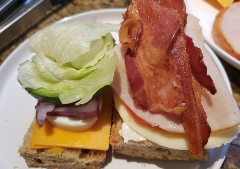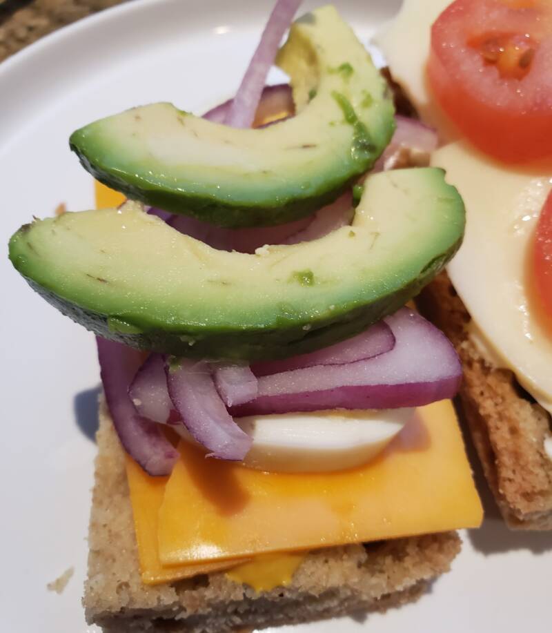 - On the other slice, place the bacon, ham, turkey and avocado.