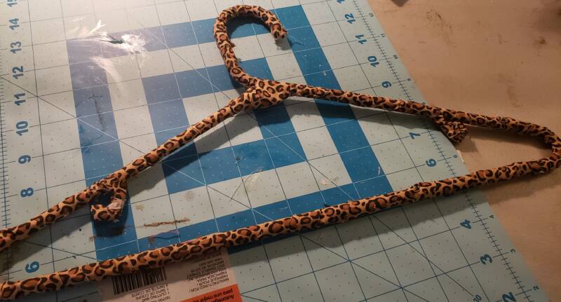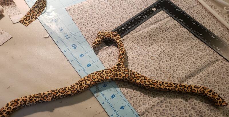 Continue wrapping until you reach the neck of the hanger. Some hangers have little hooks or indentations to accommodate certain types of clothing. Wrap the fabric around those places as best you can to cover them. When you reach the end of the hanger at the top, ensure the tip is covered in fabric. Secure with hot glue and allow to dry.