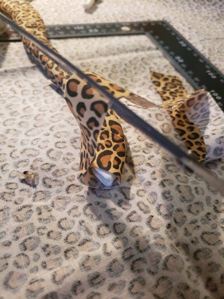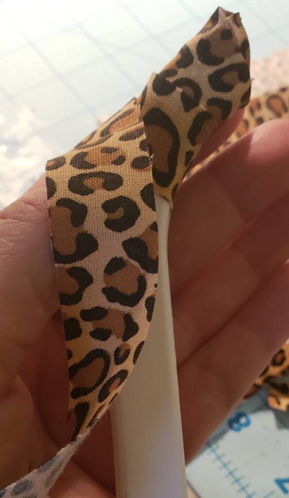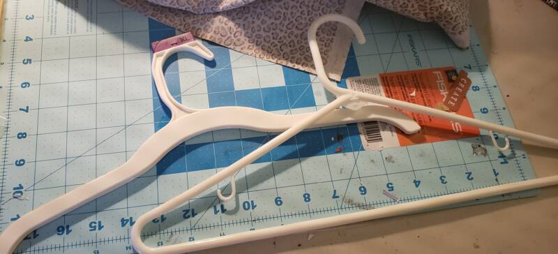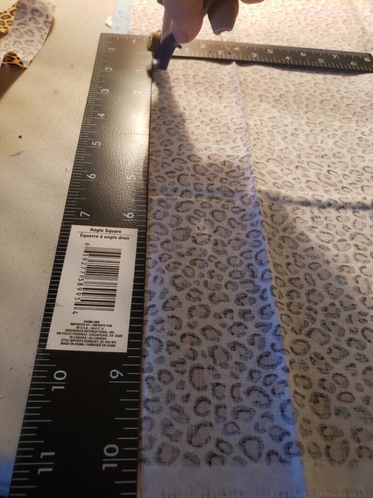 Cut the fabric into strips. For my hangers, I used a cute animal print from a fat quarter I purchased at Walmart. Measure the strips about 1 inch in width and line up the edges with a ruler. I used a fabric cutting wheel to cut the fabric.
