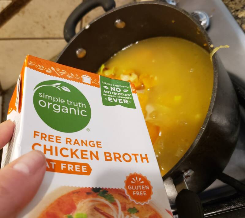 - Pour in the chicken broth and stir.