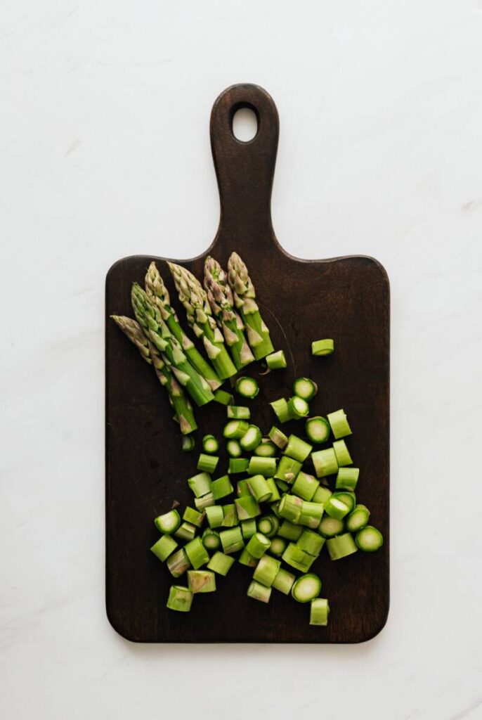 - Drop the reserved asparagus tips in the boiling water for 1-2 minutes until bright green and crisp-tender.