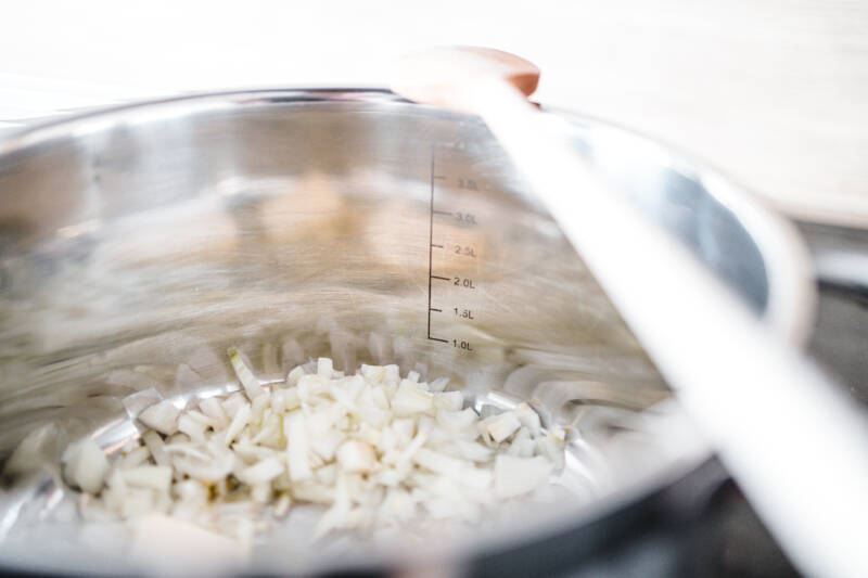 - Add the onion and sauté 2-3 minutes until softened.