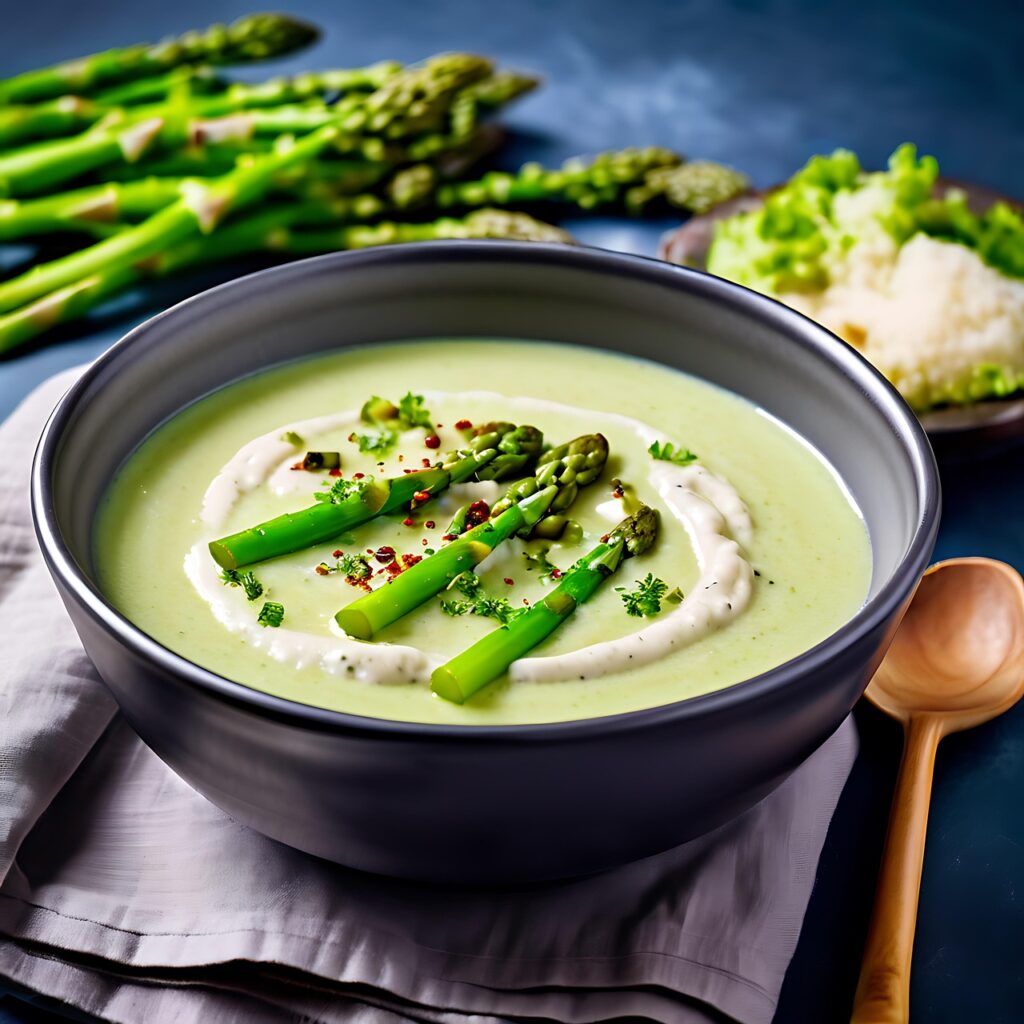 - Garnish: Blanched asparagus tips and cream