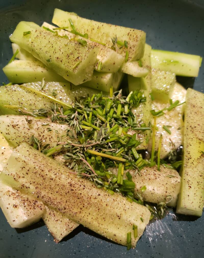 2 thoughts to “Cucumber Slices with Herbs and Garlic”