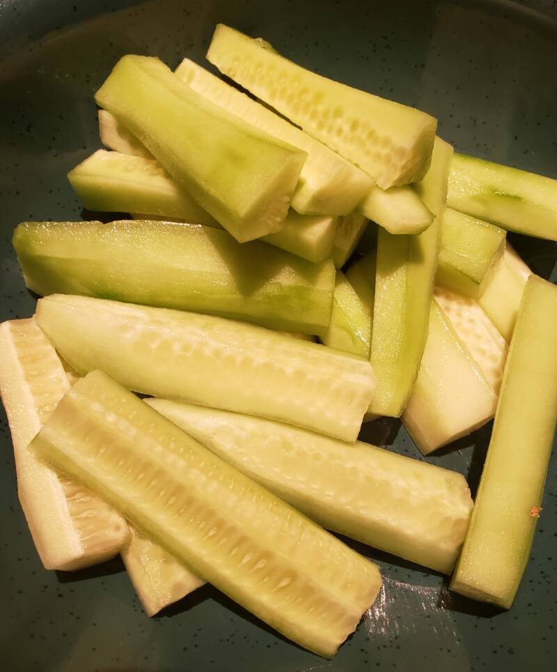 Peel the cucumbers and cut them into rounds or sticks. Sometimes I leave the peel on the cucumber; they are loaded with fiber and minerals.