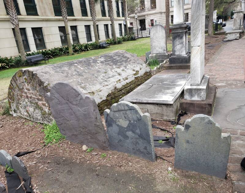 Exit the City Market through the front on Meeting Street and turn left. Walk two blocks to the Circular Congregational Church, situated between Cumberland Street and Queen Street at 150 Meeting Street.