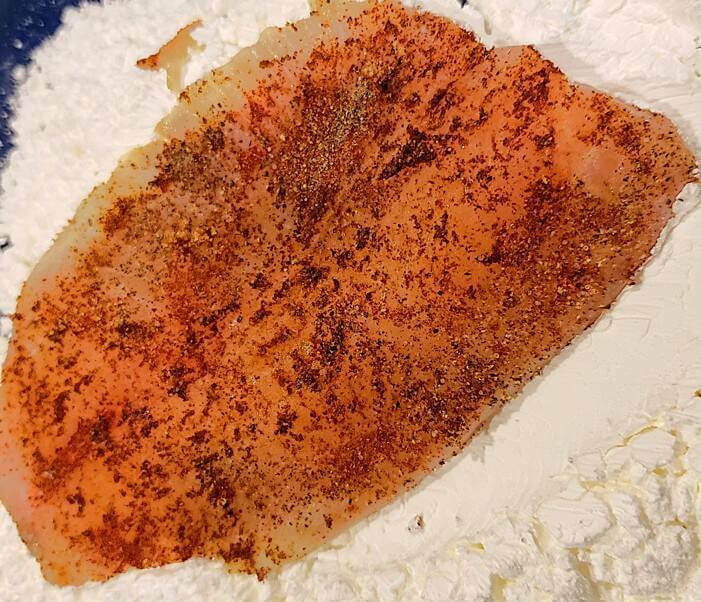 • While the oil is heating, dredge the fish filets in the Carbquik, then in the egg, and finally in the cornbread mix.
