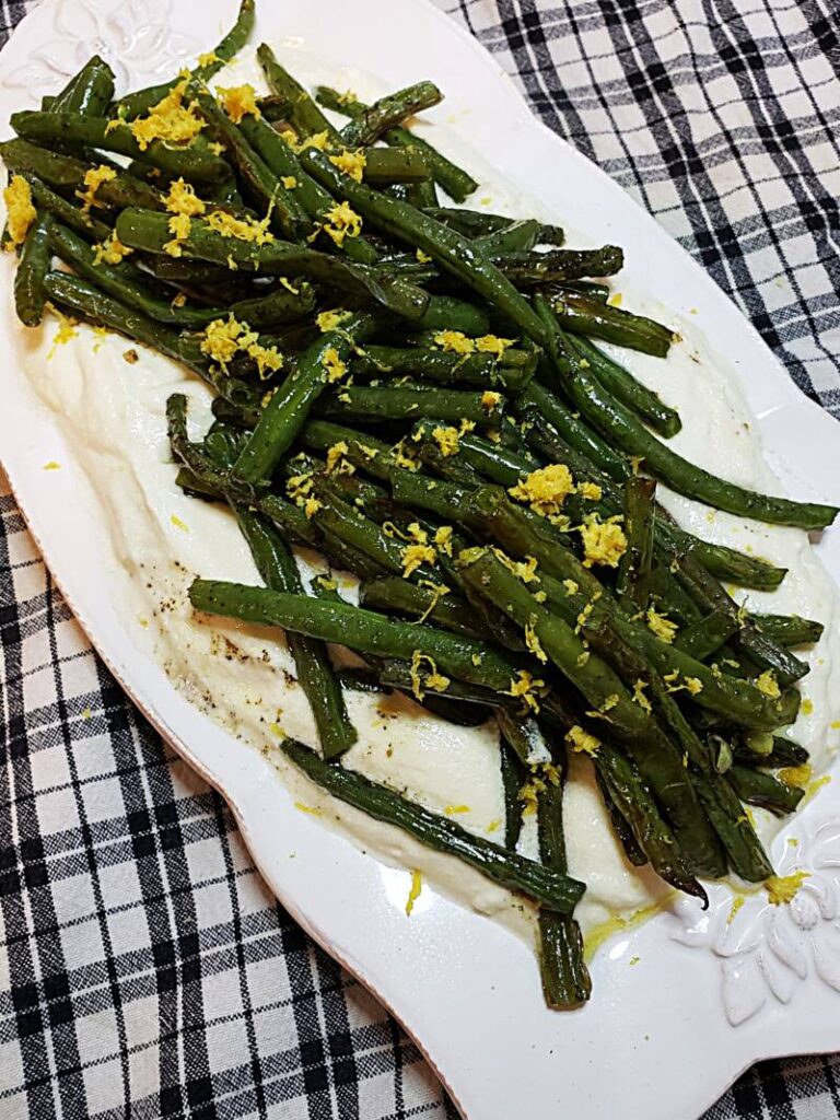 - Spread the whipped ricotta in a dish and place the roast green beans on top.