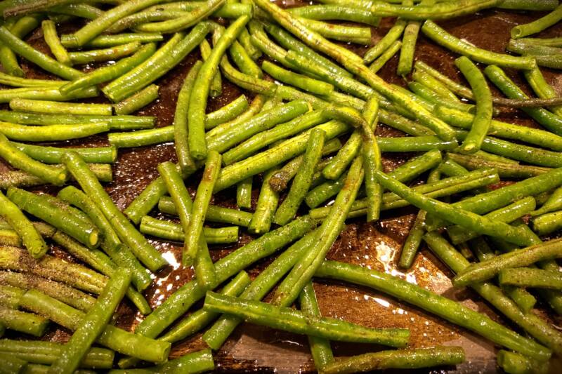 - Roast the green beans for 15 minutes in a 400-degree oven.
