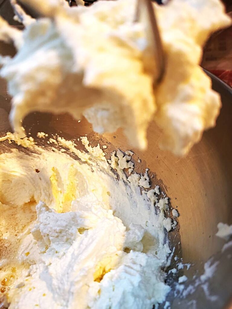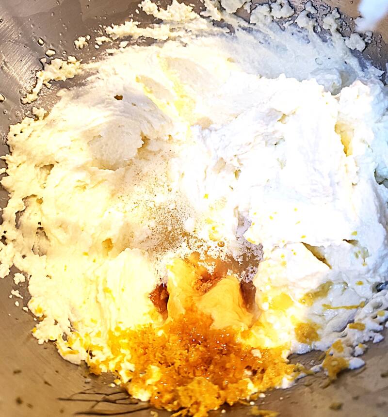 Add the orange and lemon juice and half the lemon zest.. Scrape the sides of the bowl and whip for one more minute.