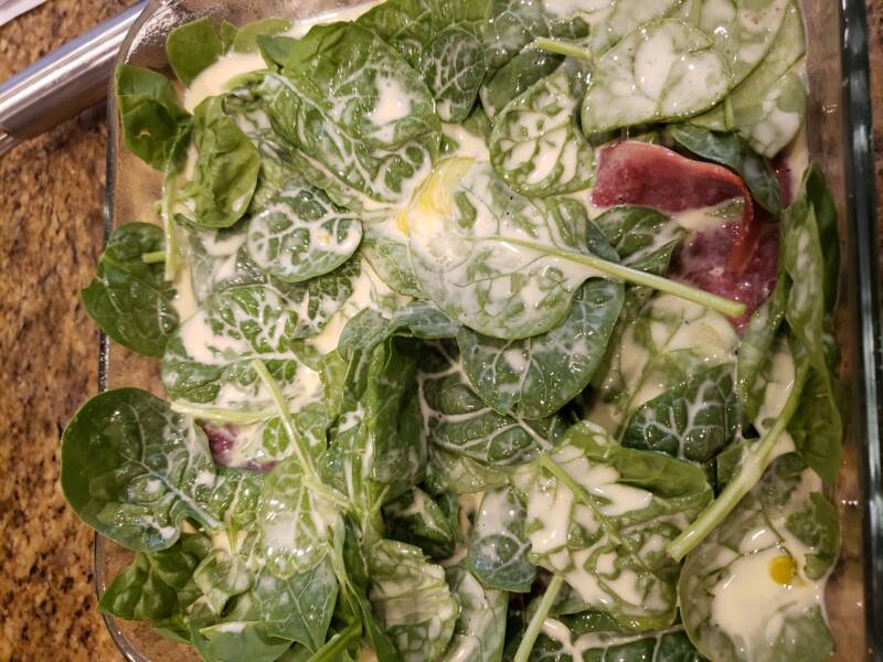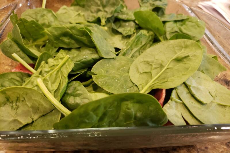 - Pour the egg mixture evenly over the top of the spinach. spread it to the corners with a spatula if needed.