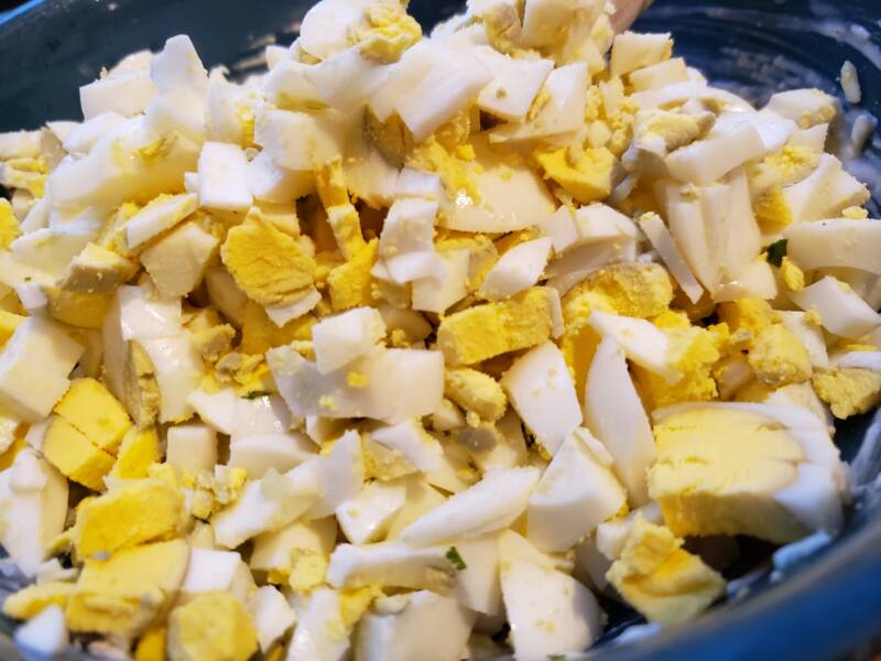 - Add the avocado slices and sliced or chopped hard-boiled eggs.
