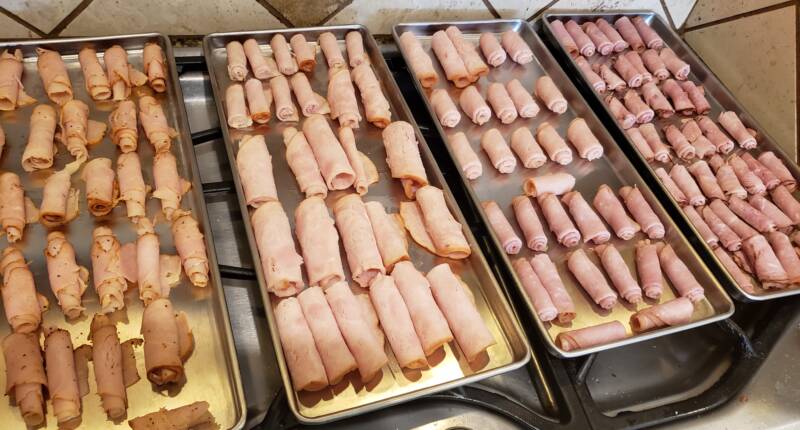 Fold the slices of deli meat in half lengthwise, then roll up like a sleeping bag. Place the meat rolls on one of the freeze-drying trays.