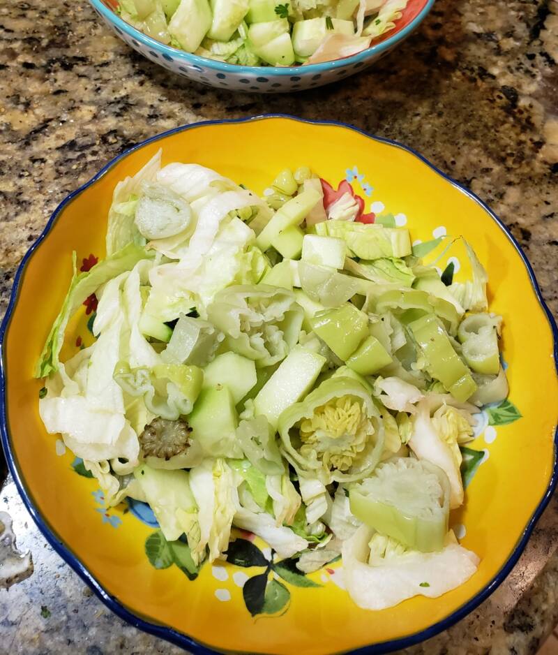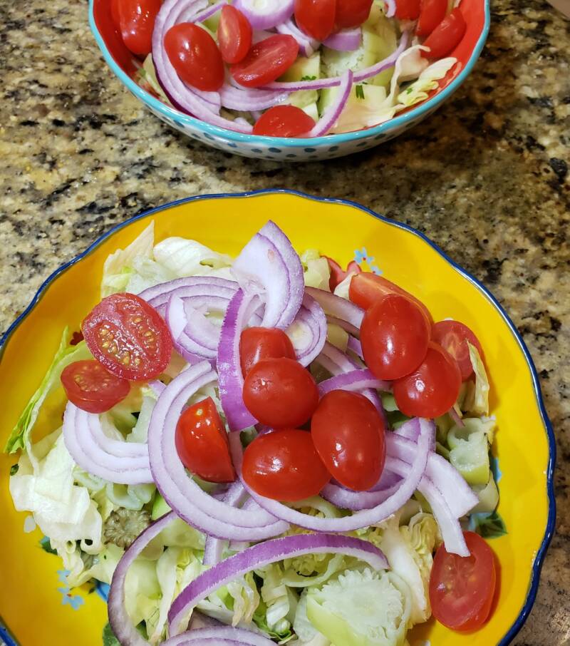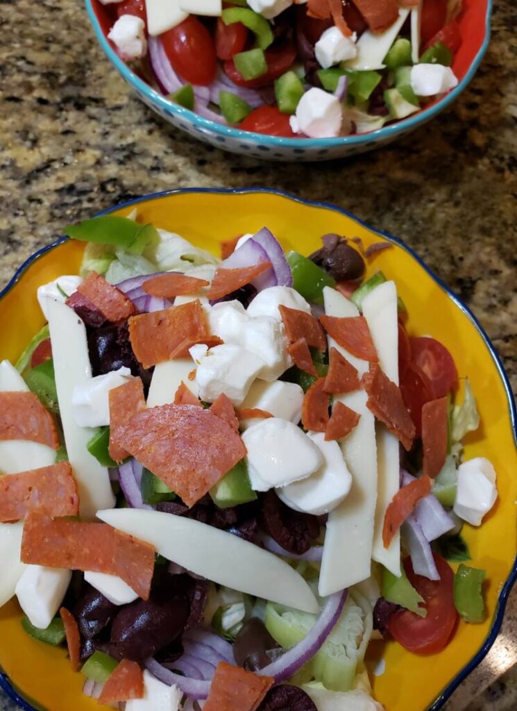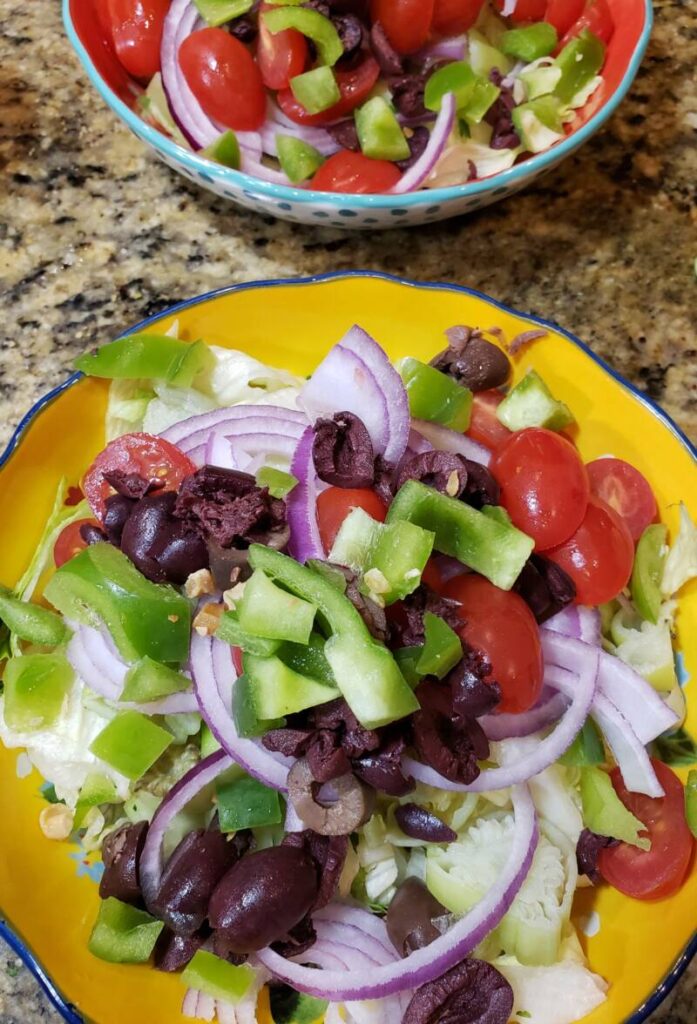 At this point, you can toss it all together. I do that when we are at home with only my family. If you serve this for a party, you can set out all the ingredients in individual bowls and allow your guests to choose what they want on their salad. Even more fun is leaving the items that are supposed to be chopped whole. Set out a chopping board and two sharp knives for your guests to chop what they want. Whenever I do this, we have a lot of laughs. It’s fun to let those knives chop, chop, chop.