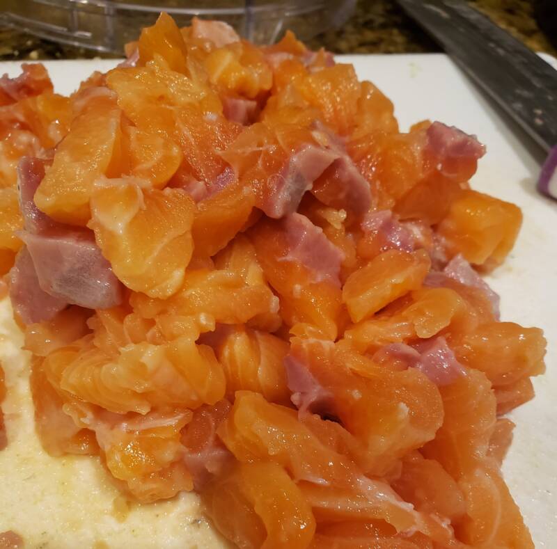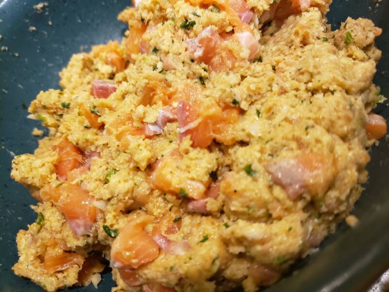 Once the skin is removed from the salmon, break up the meat into a large bowl. Add the green onion and yellow onion. Stir gently to combine.