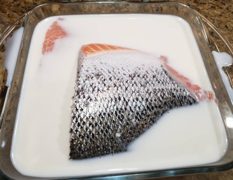 Soak the salmon in milk for about 20 minutes to remove any fishy flavor. Drain and rinse well.