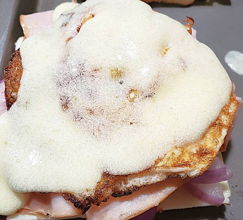 Place some sliced turkey meat on top of the cheese. Then place the fried egg on top of the turkey.
