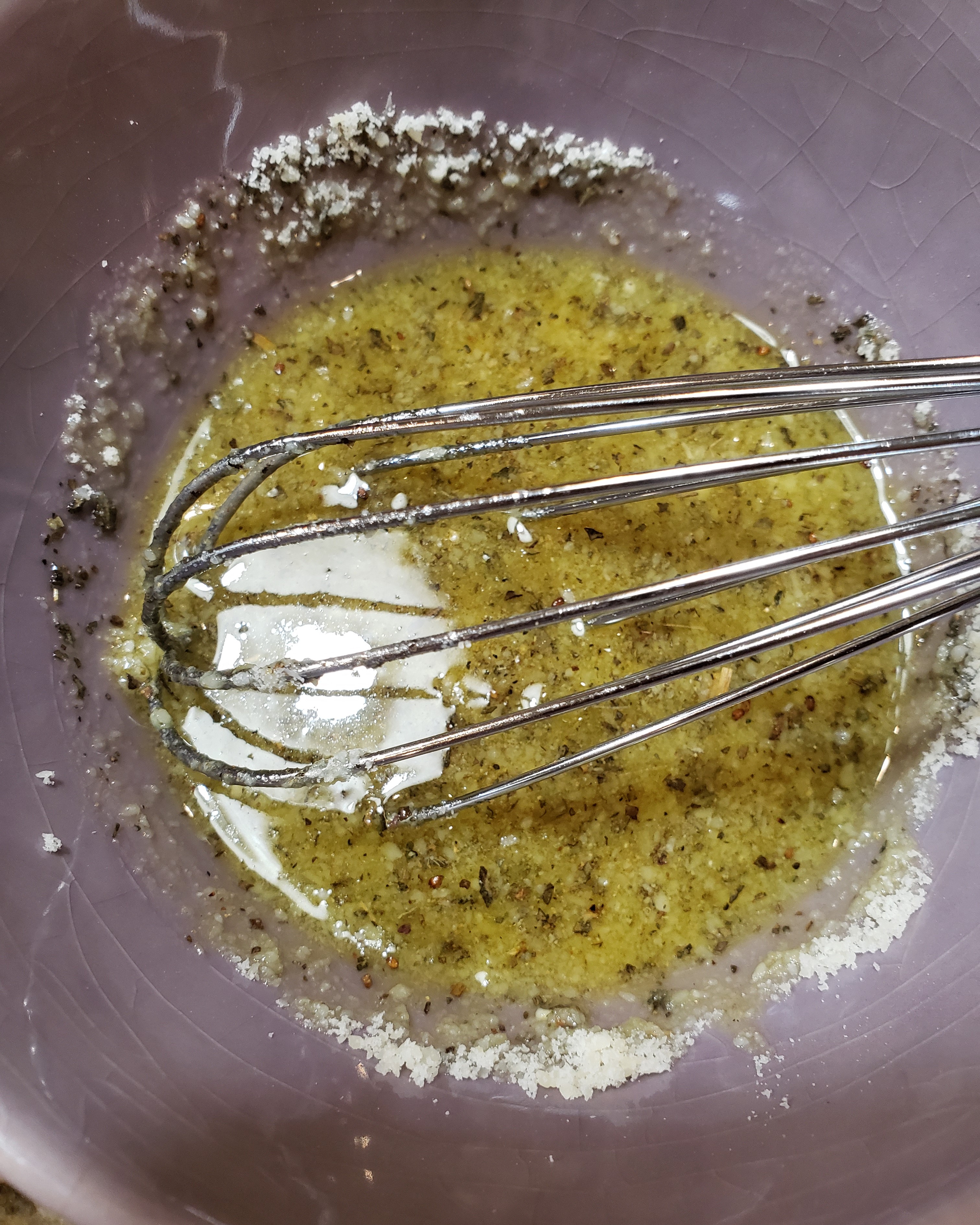 In a small bowl, mix together the garlic, parmesan cheese, salt, pepper and oregano.