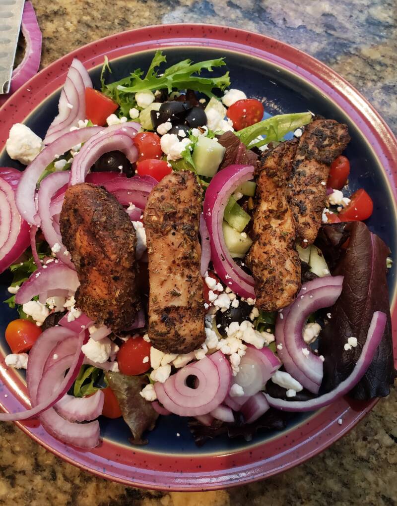The tangy dressing and marinade add a Greek flair to this salad. The components of this salad are easy to prepare ahead for quick assembly. The marinated chicken and crunchy veggies provide an abundance of textures that you will turn to for lunch or dinner. Serve with low-carb pita wedges to complete this meal.
