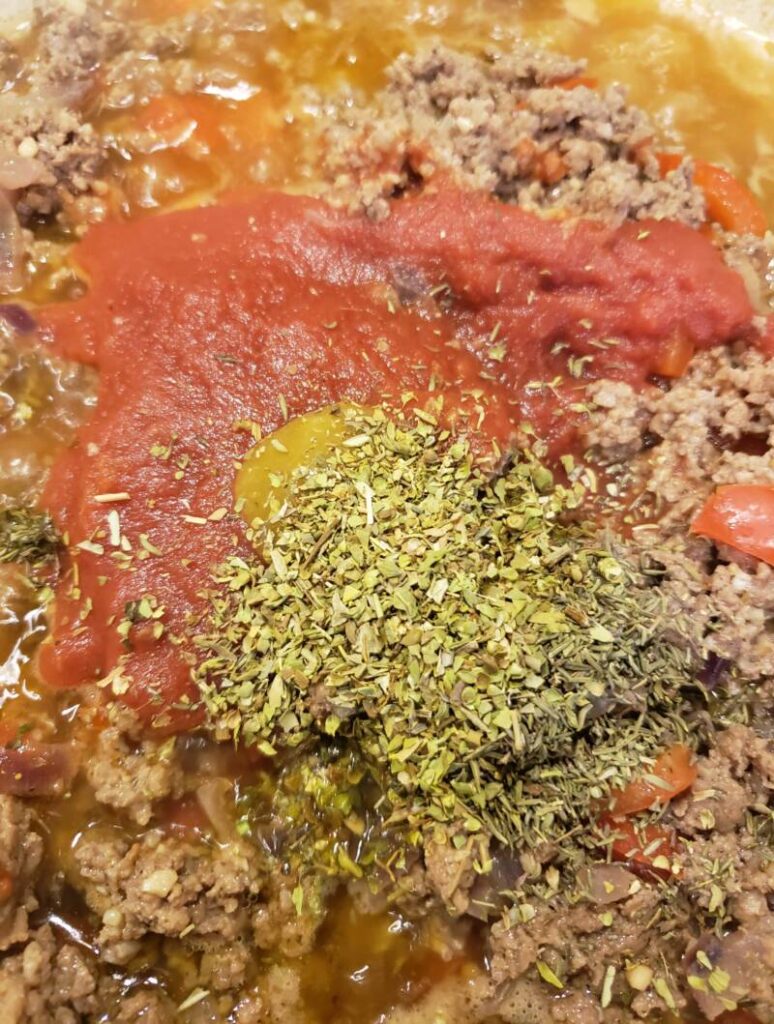 - Stir in the tomato sauce, broth, oregano, thyme, coriander, Greek seasoning, salt and pepper. Stir to combine.