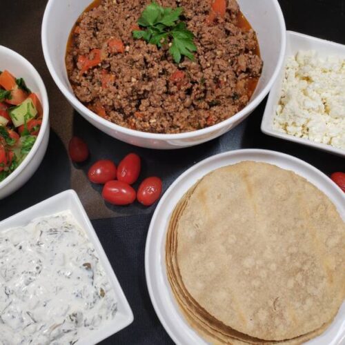 - Serve in a tortilla topped with crumbled feta cheese, cucumber and tomato relish and tzatziki sauce.
