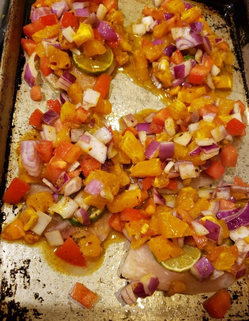 Preheat the oven to 400 degrees. In a bowl, make the salsa by adding the tomato, oranges, red pepper flakes, spices, orange zest, olive oil, salt and pepper.