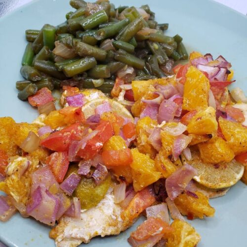 I feel like I have sunk into a fish-fixing rut! I have not served fish filets for a very long time because I was tired of how I usually prepare them. Fish always makes for a quick meal and this recipe comes together quickly. The fresh orange flavor pairs well with the fish and looks pretty on the plate. This recipe may be what I needed to kick up my fish recipe game!