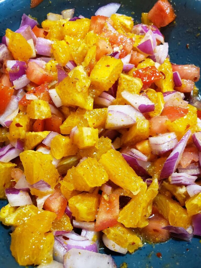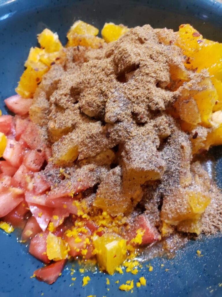 - Make the salsa by adding the tomato, oranges, red pepper flakes, spices, orange zest, olive oil, salt and pepper to a bowl.