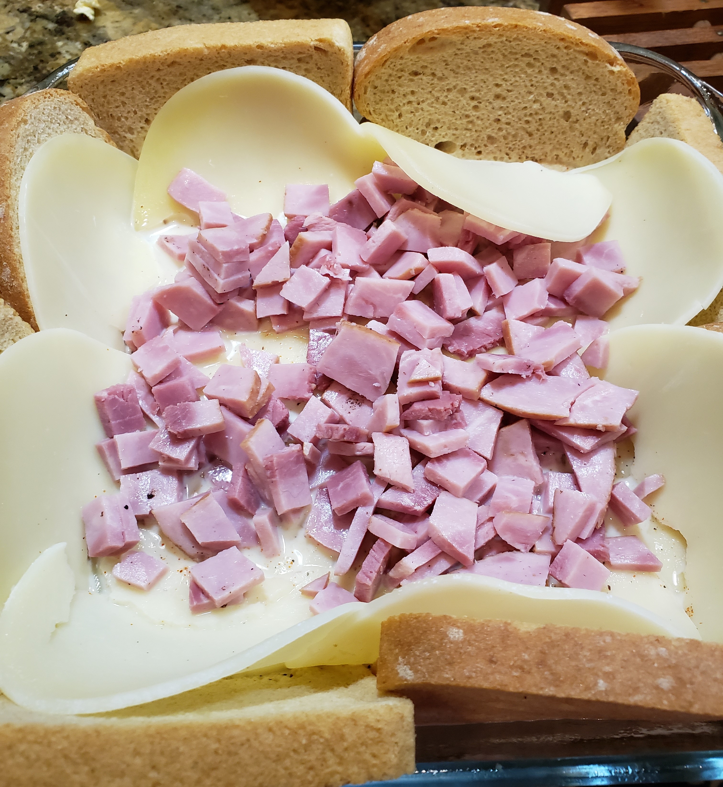In an 8×8 square pan sprayed with cooking spray, line the pan with the bread slices by placing 4 slices on the bottom. Slice the remaining bread slices in half and place them along the sides of the dish. Similarly, place the cheese on the bread, cutting the slices in half for the sides. Spread the chopped ham pieces over the bottom of the dish.