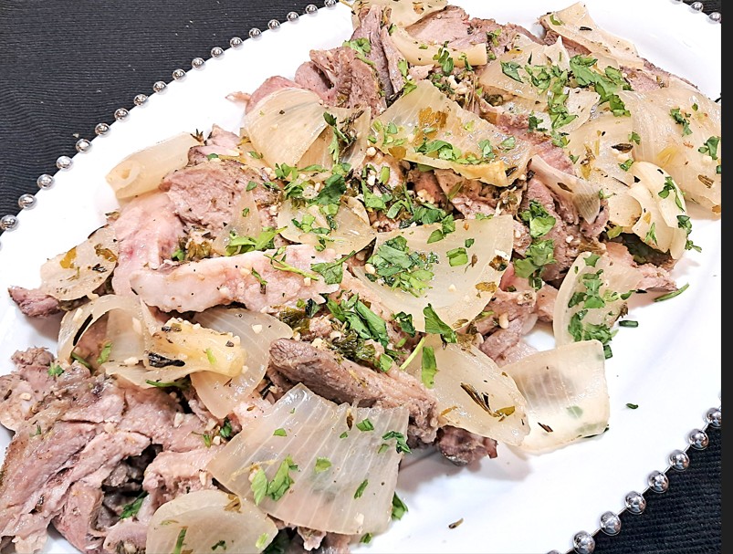 Slice the meat against the grain. Ladle the broth and onions over the top of the lamb on a serving platter. Sprinkle with fresh parsley to garnish.