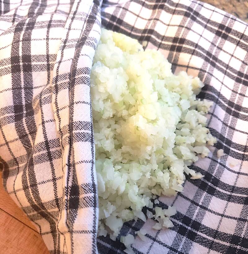 - Transfer cauliflower rice to a dish towel and squeeze out water until mostly dry.