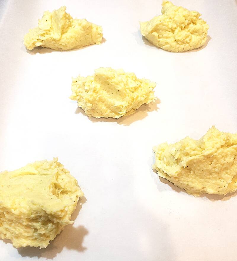 Flatten with the back of a spoon. Bake for 10 minutes. Flip and bake for 6-7 more minutes. Remove and place on a baking rack for 10-15 minutes.