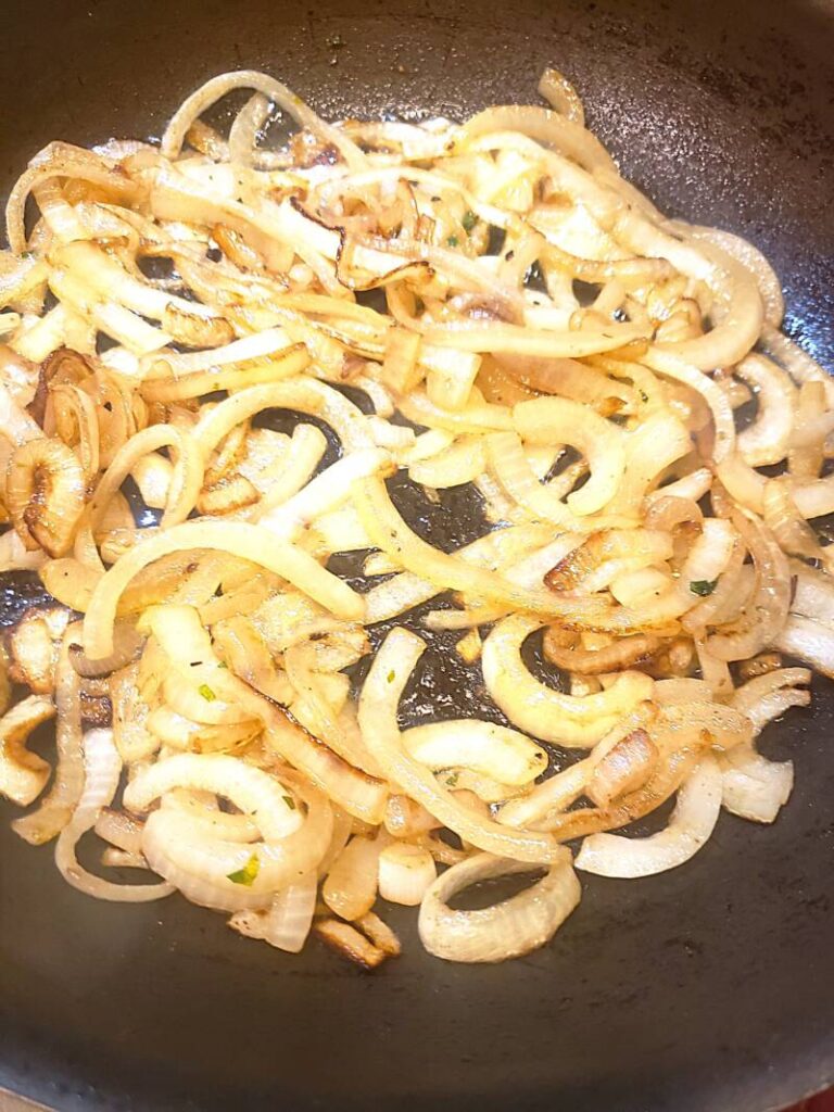 - Saute the sliced onions for about 20 minutes. They should be a nice caramel-brown color.